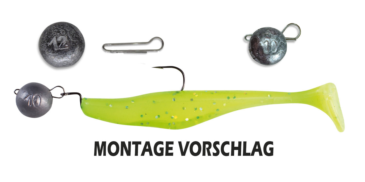 - Leicht und schnell auswechselbare Gewichte, ohne den Köder zu beschädigen, da Haken im Köder verbleibt